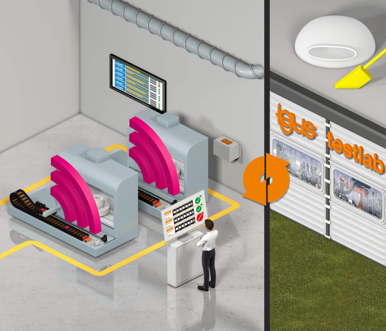 Il sistema isense online permette di pianificare in modo ottimale il lavoro dei team di manutenzione. Questo si basa sui dati del laboratorio di prova più grande del mondo nel ns. settore. Un laboratorio da 2.750 metri quadrati, per sistemi motion plastic. Solo qui ogni anno vengono effettuati oltre 10 miliardi di cicli di prova per catene portacavi.