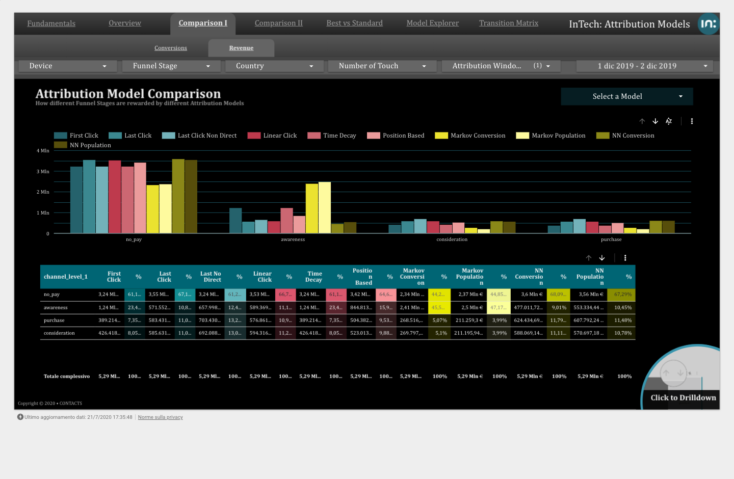 Attribution è il tool che risponde alle seguenti domande: come hanno agito le iniziative di comunicazione su tutto il marketing funnel? Le attività di awareness che impatto hanno avuto sulle conversioni (acquisti o lead generation)? Quali sono stati i touchpoint che mi hanno permesso di acquisire il cliente? Come faccio a capire se il media mix delle mie campagne è corretto? Il budget che ho allocato sulle campagne è corretto? Quali correttivi potrei attuare per massimizzare i risultati? Analizzando i dati di provenienza e poi di atterraggio e raggiungimento degli obiettivi sulle property digitali (app o sito), ma eventualmente anche nei negozi fisici se i dati fossero integrati o integrabili, il tool è in grado di stabilire e pesare l’efficacia di ogni singolo canale e ogni singola campagna del brand. Tramite tecniche di machine learning, riesce ad andare oltre i modelli di attribuzione classici, permettendo un’analisi dettagliata e una comparazione significativa dei risultati. Grazie a questo tool è possibile per il brand ottimizzare il ROI, riassegnando i budget in modo ottimale, e avere forecast di scenario.