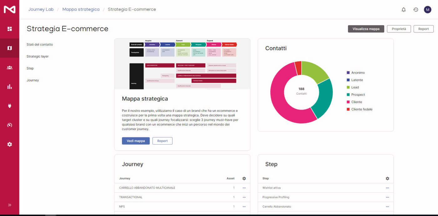 Costo: Variano in funzione dei contatti e sono suddivisi nei piani Starter (41 euro al mese), Professional (740 euro al mese) ed Enterprise (da 2.944 euro al mese). C’è anche una versione free per cominciare a esplorare la piattaforma. Prezzi in dettaglio qui