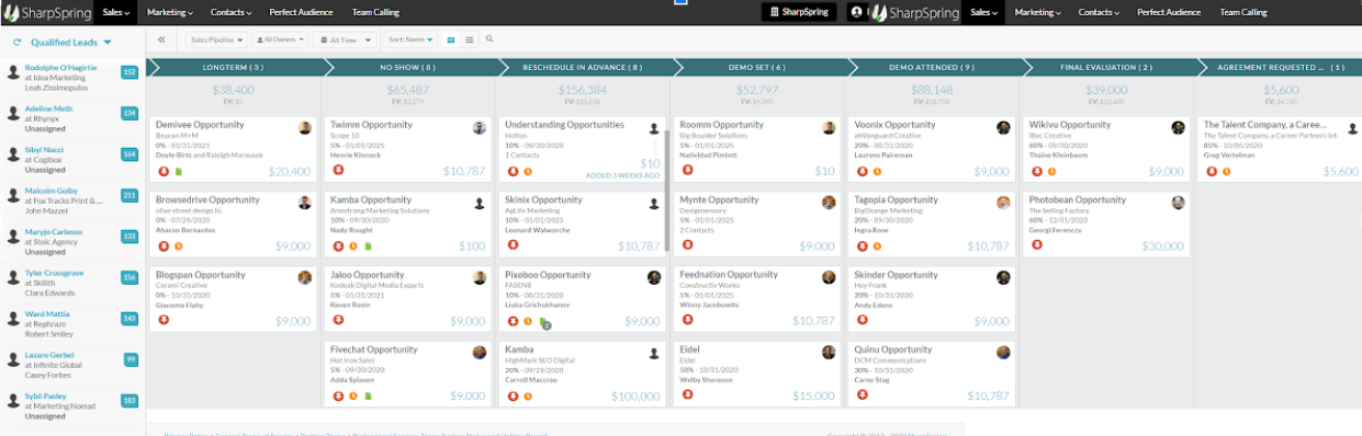 SharpSpring è una società americana quotata in borsa che conta più di 10.000 clienti e oltre 2.000 agenzie come rivenditori del software. La piattaforma, sviluppata nel 2011, consente di avviare conversazioni con messaggi personalizzati e campagne automatizzate in relazione al comportamento degli utenti. È possibile ottenere analisi dettagliate su ogni interazione dell’utente, in modo da poter inviare il messaggio giusto al momento giusto e attivare il team di vendita all’azione con notifiche in tempo reale. Il software segmenta il database principalmente tramite il lead scoring, le liste e i tag. Il contatto diventa caldo grazie allo scoring che si utilizza per assegnare un punteggio in base, ad esempio, al coinvolgimento o al monitoraggio della pagina. In relazione ai lead più caldi è possibile ricevere un elenco ogni giorno direttamente nella casella di posta per poi agire al momento giusto per convertirli in vendite. Inoltre, è possibile dividere il database in liste, dinamiche o statiche, per conoscere e analizzare al meglio il pubblico in relazione a trigger specifici. E, sfruttando i tag, ovvero etichette utili a segmentare e conoscere contatti e clienti, tramite le automazioni è possibile gestire al meglio i trigger e i filtri già presenti o costruire le liste automatizzate. SharpSpring presenta anche pipeline e le relative opportunità. Le pipeline forniscono ai venditori una rappresentazione visiva di dove si trovano i potenziali clienti nel processo di vendita e consentono ai manager di prevedere i ricavi osservando in quali fasi si trovano le opportunità, ovvero le trattative aperte con le aziende e i contatti nel CRM, prevedendo quante si chiuderanno come trattative durante un determinato periodo di tempo.