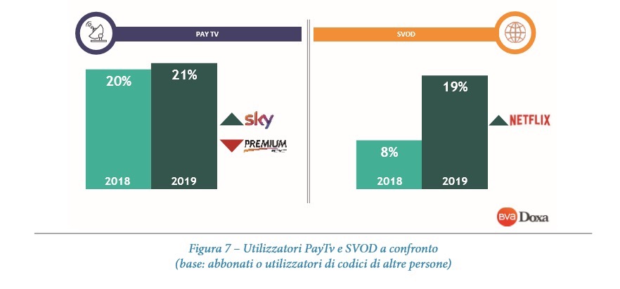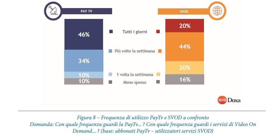 Se in termini di utenti che vi hanno accesso il mercato delle PayTv è piuttosto stabile, il settore SVOD è in forte crescita: utilizza questi servizi online il 19% della popolazione Internet italiana, rispetto all’8% di 12 mesi fa. Il consumatore finale che utilizza i servizi di PayTv ha però una maggiore frequenza di visione: il 46% degli abbonati la guarda tutti i giorni rispetto al 20% degli utenti SVOD.