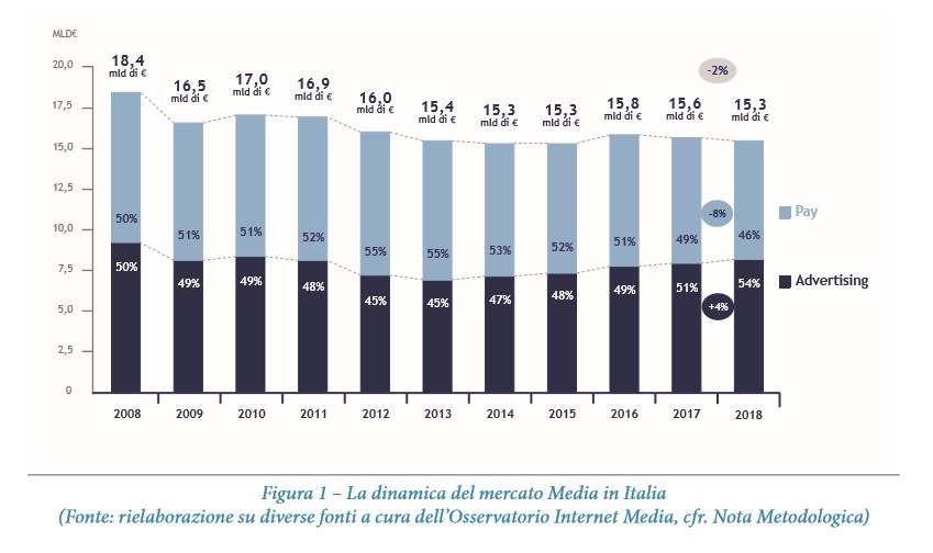 Se ci si concentra sulla sola componente pubblicitaria, evidenzia ancora l’Osservatorio, il valore di questo settore a fine 2018 era di 8,2 miliardi di euro con l’Internet advertising a rappresentare il 37% del totale.
