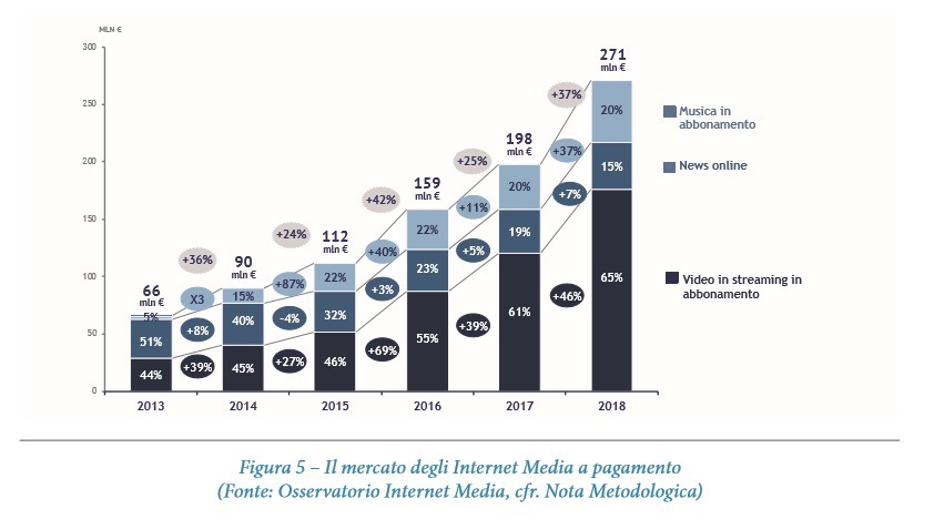 Il mercato complessivo delle vendite di contenuti media in Italia chiude il 2018 in contrazione (-8%) con un valore di 7,1 miliardi di euro. Il mercato è dominato dalla Tv (62% di quota di mercato) e dalla stampa (34%). La componente derivante da Internet è molto marginale (4%) e si assesta poco sopra ai 270 milioni di euro, ma fa registrare un incremento del 37% rispetto al 2017. Il 65% dei ricavi degli Internet media a pagamento sono legati alla vendita di contenuti video online (in SVOD, ossia abbonamenti a servizi di Video On Demand); seguono i ricavi per gli abbonamenti a servizi musicali (il 20% del mercato) e i ricavi legati alle news (15%).