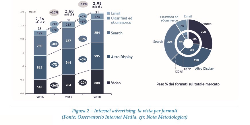 L’Internet advertising ha raggiunto a fine 2018 il valore di 2,98 miliardi di euro, in crescita dell’11% rispetto al 2017. I primi risultati del 2019 evidenziano una crescita più bassa degli ultimi anni e che potrebbe essere al di sotto del 10%, con un mercato complessivo in valore assoluto che si assesterà nell’intorno dei 3,2 miliardi di euro.