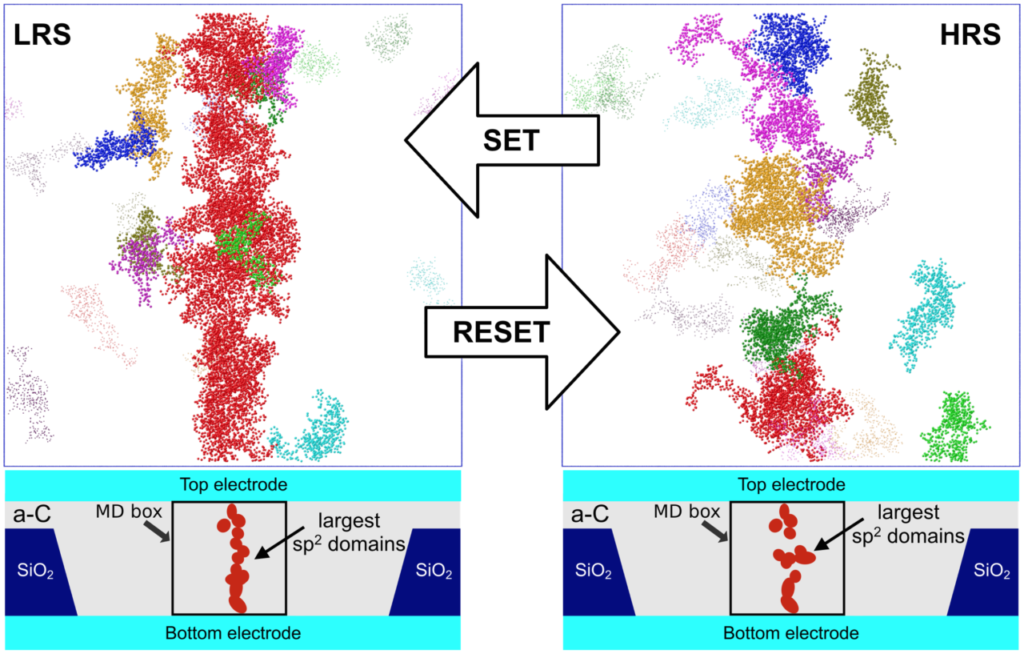 Figura 1. Schema di una memoria resistiva. Il materiale resistivo (area in grigio), in questo caso carbonio amorfo contenente per lo più atomi di carbonio sp3. I più estesi cluster di atomi sp2 coniugati contenuti nella matrice amorfa sp3 sono illustrati in rosso nei due pannelli inferiori. Due elettrodi (color ciano) sono accoppiati al materiale resistivo. Un materiale elettricamente isolante, in questo caso silice (color blu scuro), viene usato per separare i due elettrodi. Applicando un campo elettrico tra i due elettrodi è possibile indurre una re-ibridizzazione degli atomi di carbonio, prodotta dal calore prodotto per effetto Joule nel carbonio amorfo. A seconda della durata e intensità del campo applicato, è possibile ridurre (SET step) o aumentare (RESET step) la resistenza del carbonio amorfo. Nei pannelli superiori è mostrato il funzionamento della memoria tramite simulazioni atomistiche di dinamica molecolare. Per chiarezza sono indicati con sfere solo gli atomi di carbonio sp2 che formano i cluster coniugati più estesi (percorsi che offrono minore resistenza per la conduzione di elettroni). Nello stato a bassa resistenza (LRS Low Resistance State, pannello a sinistra) il cluster di colore rosso si estende per tutto lo spessore del campione. Durante il RESET step i cluster più estesi sono frammentati in gruppi di atomi coniugati più piccoli. Di conseguenza la resistenza elettrica del materiale tra i due elettrodi aumenta. La cella è ora nello stato ad alta resistenza (HRS High Resistance State, pannello a destra).