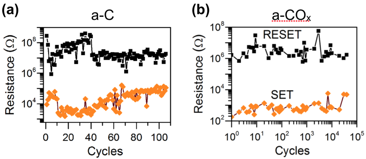 Figura 2. Risultati sperimentali su memorie contruite con (a) carbonio amorfo e (b) carbonio amorfo ossigenato. Si mostra che introducendo ossigeno nel carbonio amorfo il numero di cicli di scrittura è incrementato di circa un fattore 100.