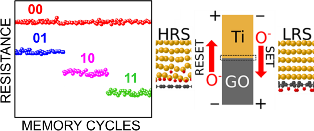 L’ossigeno offre vantaggi anche nelle memorie basate sul grafene. Nell’ambito di CareRAMM, i ricercatori di University of Exeter hanno costruito una memoria che utilizza come materiale resistivo ossido di grafene accoppiato a titanio. In questo dispositivo il cambiamento di resistenza è prodotto da reazioni redox reversibili all’interfaccia ossido di grafene/titanio. La figura, pubblicata in ACS Nano 11, 3010−3021 (2017), mostra come in questa memoria sia possibile impostare in modo controllato quattro valori di resistenza. Questo permette di immagazzinare 2-bit di informazione per cella. Memorie basate sull’ossido di grafene offrono vantaggi in termini di basso costo, alta flessibilità meccanica del materiale e alta trasparenza ottica, che rendono queste memorie molto attraenti per future applicazioni in tecnologie che richiedono trasparenza e flessibilità.