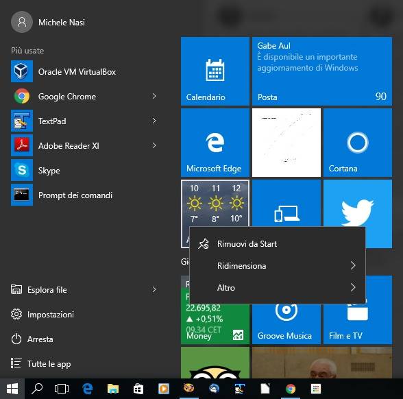 Cliccando con il tasto destro del mouse su una qualunque piastrella visualizzata nel menu Start, è possibile ridimensionarla, rimuoverla o chiedere l’inserimento di un collegamento nella barra delle applicazioni (l’operazione si chiama pinning).