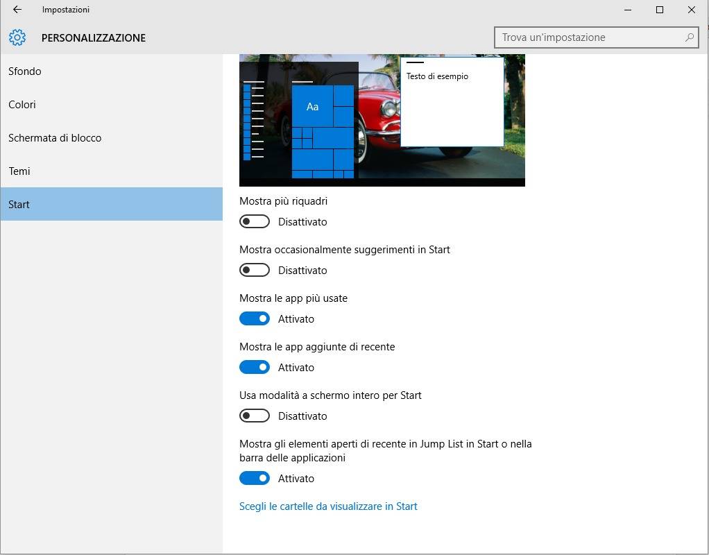 Con un clic su Impostazioni quindi su Start, è possibile personalizzare ulteriormente il comportamento del menu.