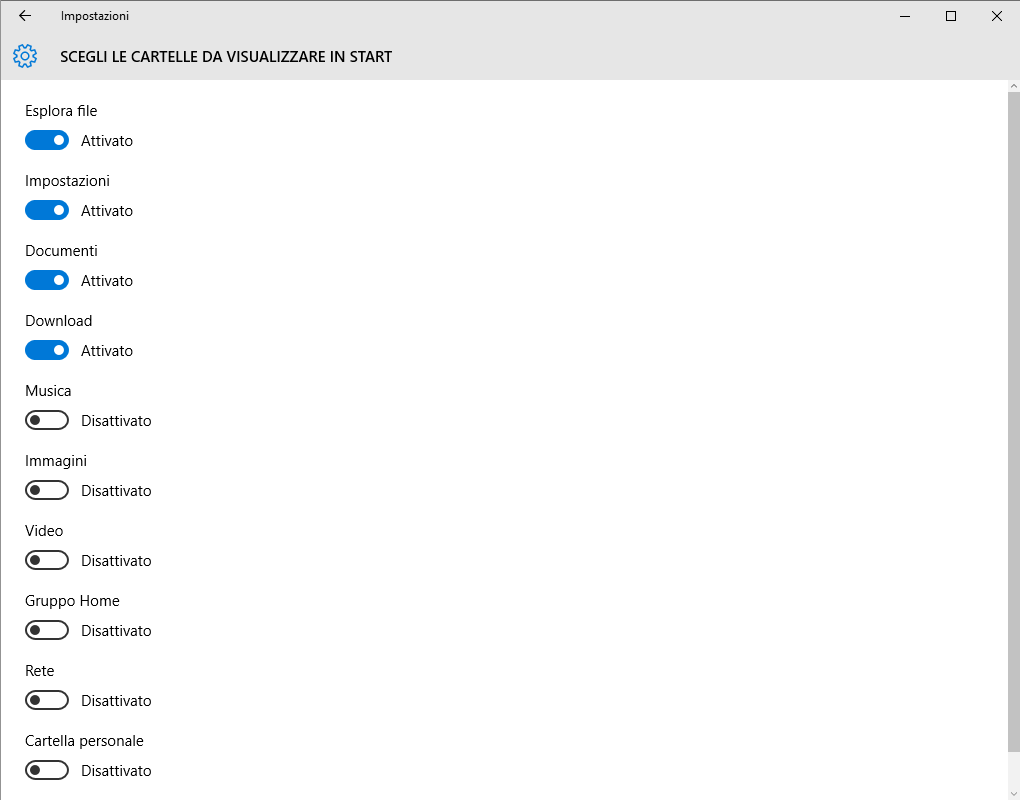 Infine, cliccando su Scegli le cartelle da visualizzare in Start, si ha la possibilità di inserire tutti i collegamenti alle cartelle che si utilizzano più spesso.