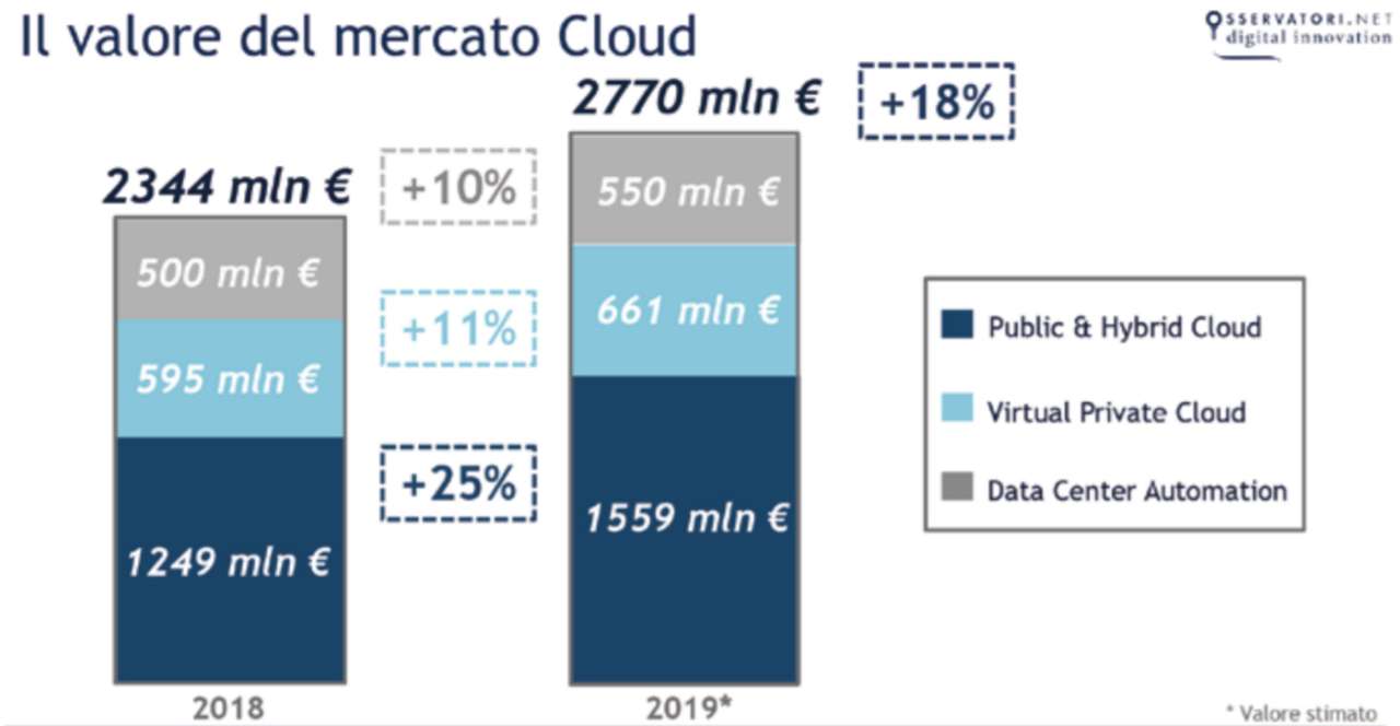 A fine 2019 il mercato cloud italiano varrà 2,77 miliardi di euro, in crescita del 18% rispetto al valore di consuntivo del 2018, pari a 2,34 miliardi.