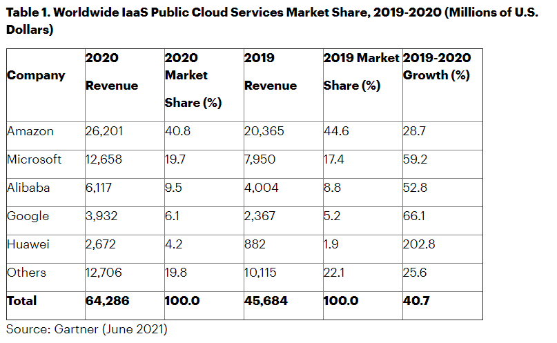 Amazon ha mantenuto la prima posizione nel mercato IaaS nel 2020, seguita da Microsoft, Alibaba, Google e Huawei.