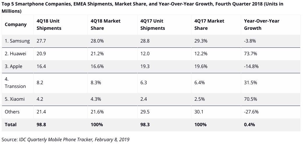 Secondo l’ultima ricerca di Idc, Huawei ha continuato la sua rapida ascesa nel mercato smartphone Emea nel quarto trimestre del 2018. L’azienda cinese si è aggiudicata un quarto del mercato Android per la prima volta nella regione.