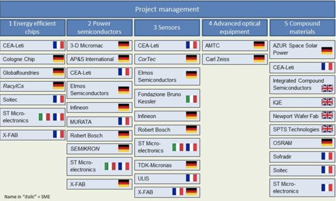 I cinque settori tecnologici sono complementari e interconnessi: i chip di norma non vengono venduti da soli, ma sono spesso forniti come parti di un sistema integrato. Tali sistemi richiedono una combinazione di processi e tecnologie che rientrano nei diversi ambiti del progetto. Per questo motivo, i partecipanti al progetto saranno coinvolti in oltre 100 collaborazioni tra i vari settori, in 40 sottoprogetti strettamente intercorrelati.