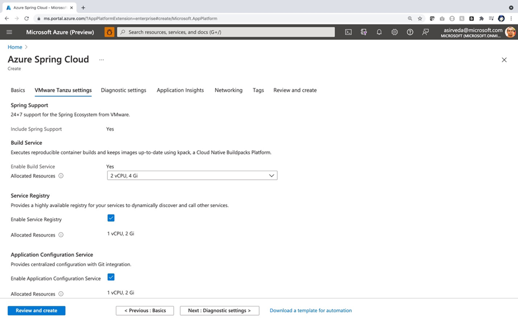 Tanzu Build Service, Tanzu Application Configuration Service e Tanzu Service Registry sono disponibili durante la fase di preview. I clienti avranno la flessibilità di selezionare quali componenti Tanzu vogliono durante o dopo la creazione dell’istanza.