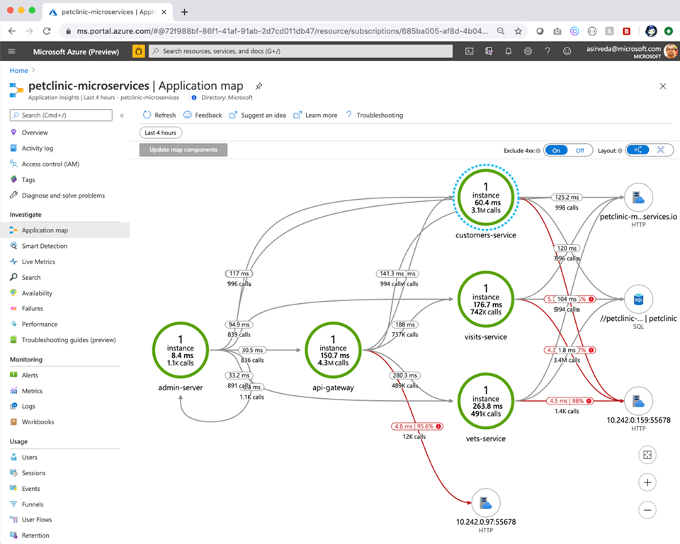 Dopo aver creato la propria istanza e aver distribuito le proprie applicazioni, è possibile monitorare facilmente con Application Insights o altri strumenti di application performance management (APM) che il cliente sceglie di usare. Come per il livello standard, Azure Spring Cloud Enterprise viene fornito con il supporto out-of-the-box per l’aggregazione di log, metriche, tracce di app distribuite e avvisi.