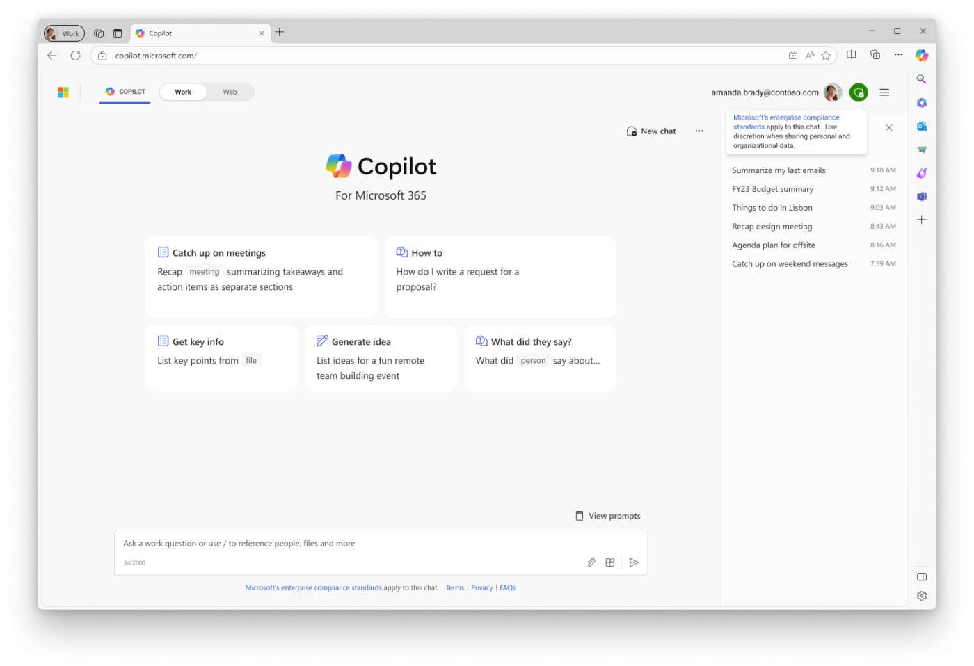 Il contesto lavorativo – evidenzia Microsoft – permette di andare ancora oltre, basandosi sui dati del proprio lavoro, ovvero il calendario, le e-mail, le chat, i documenti, le riunioni, i contatti e altro ancora, in modo da ottenere risposte contestualmente accurate. Copilot può aiutare gli utenti: a scansionare rapidamente la propria posta elettronica per trovare messaggi importanti a cui dare priorità; a prepararsi per le riunioni chiave estraendo informazioni da tutto il loro lavoro; a ideare il percorso migliore da seguire. Il contesto di lavoro beneficia anche di una protezione dei dati di livello aziendale, che garantisce che i dati rimangano all’interno dei confini del servizio Microsoft 365.