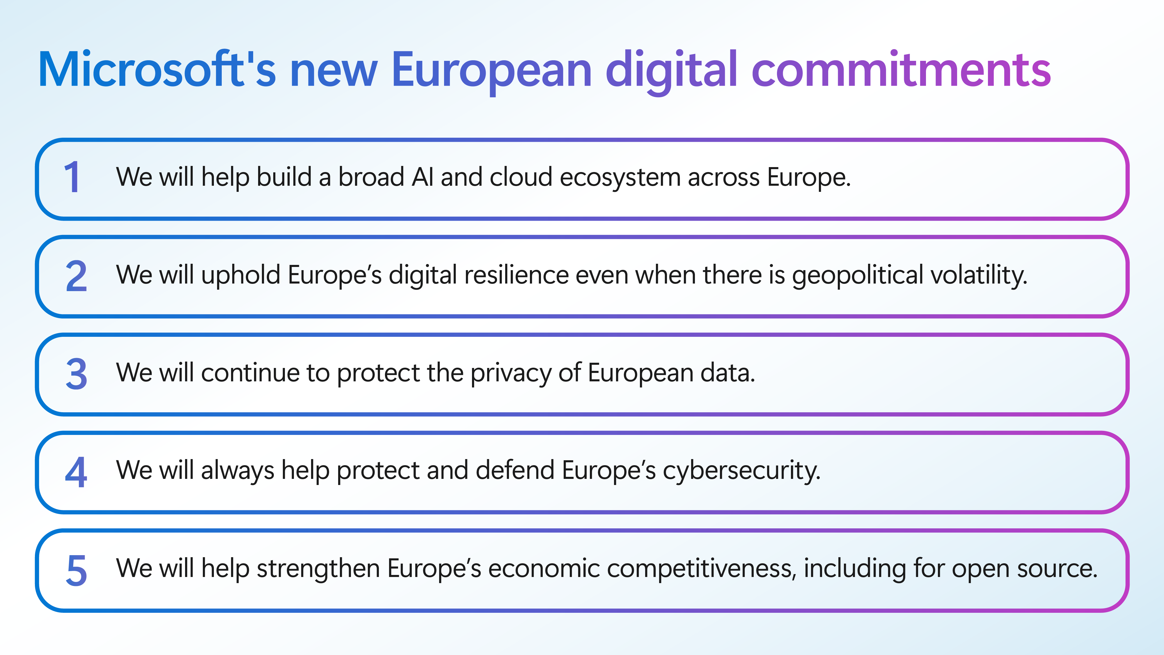 In un momento di volatilità geopolitica, sottolinea la società americana, Microsoft conferma la propria posizione nel voler garantire stabilità digitale. Per questo motivo, oggi Microsoft annuncia cinque nuovi impegni nel settore digitale per l’Europa.