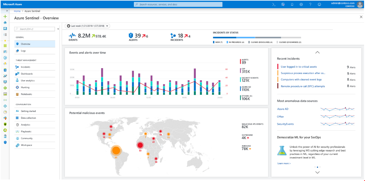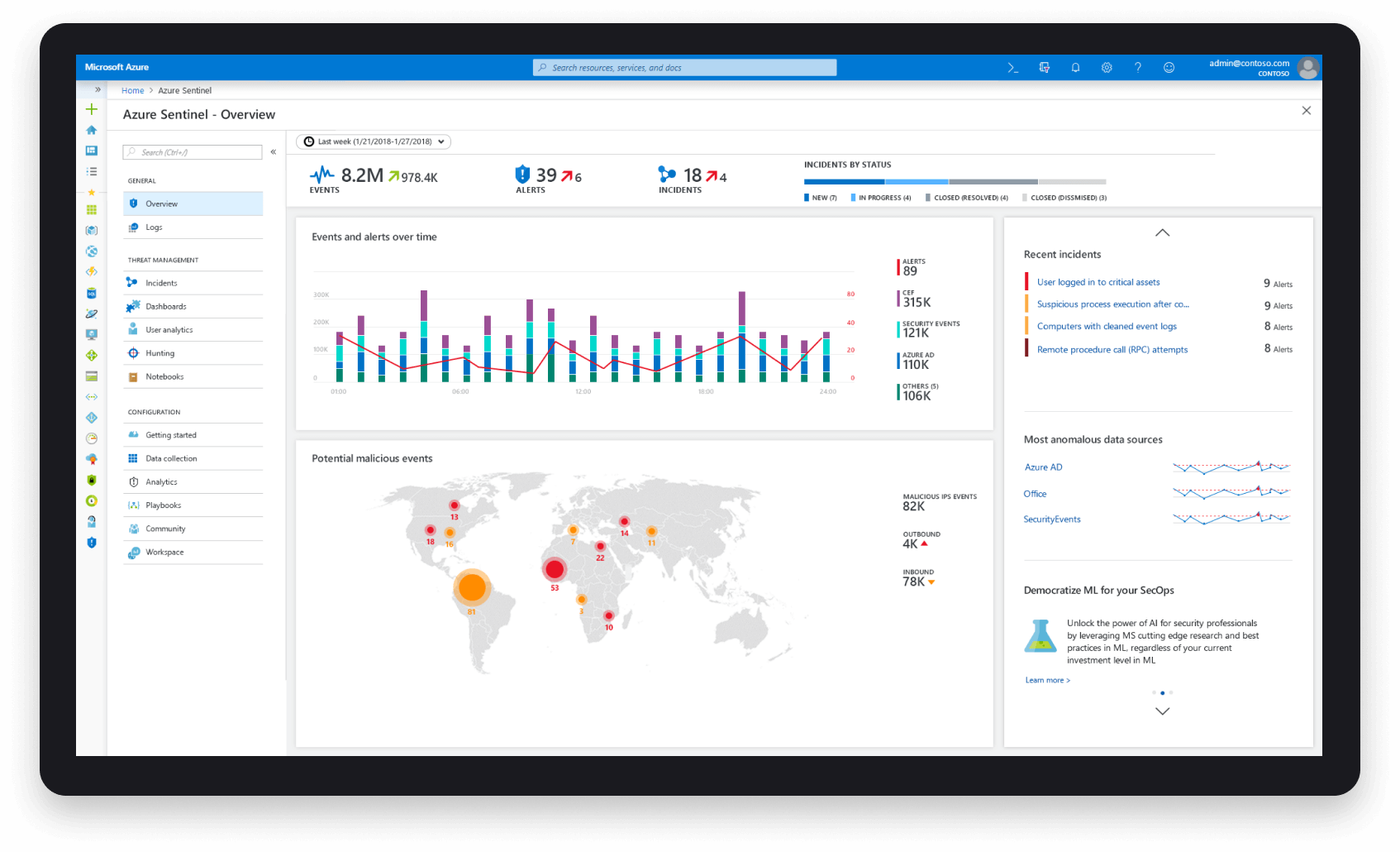 Microsoft Azure Sentinel è per l’appunto il primo SIEM nativo all’interno di una importante piattaforma cloud. L’intelligenza artificiale aiuta a ridurre drasticamente il rumore: fino al 90 percento con gli early adopter, afferma Microsoft. Poiché la soluzione è basata su Azure, consente inoltre di sfruttare velocità e scalabilità del cloud, quasi illimitate. E di investire il tempo di lavoro nella sicurezza, e non nei server. Tra l’altro, con pochi clic è possibile inserire i dati di Microsoft Office 365 e combinarli con gli altri dati di sicurezza per l’analisi.