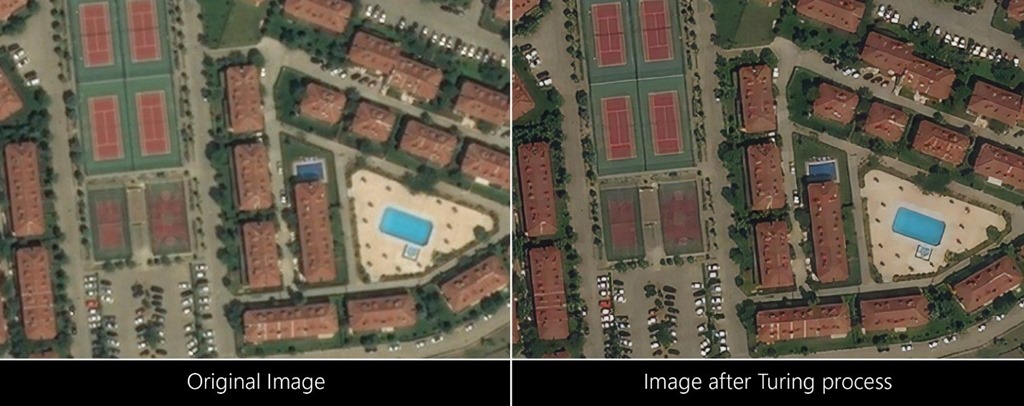 La super-risoluzione semantica della ricerca del progetto Turing permette a Microsoft di usare immagini satellitari e aumentare la risoluzione affinché sia paragonabile a quella aerea, aiutando notevolmente la percezione umana delle immagini.
