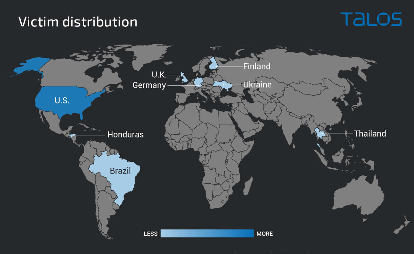 Queste attività, secondo gli esperti di sicurezza di Cisco, colpiscono prevalentemente gli utenti negli Stati Uniti, con un numero minore di infezioni in Gran Bretagna, Germania, Ucraina, Finlandia, Brasile, Honduras e Thailandia.
