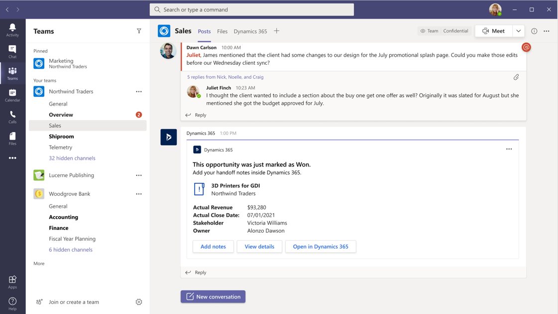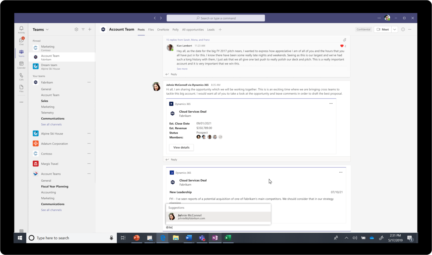 Gli utenti di Dynamics 365 possono ora invitare chiunque nell’organizzazione a visualizzare e collaborare ai record dei clienti proprio all’interno del flusso di una chat o di un canale Teams, garantendo che le persone giuste possano intraprendere l’azione migliore in modo più rapido ed efficiente, senza dover cambiare contesto tra più app e fonti di dati.