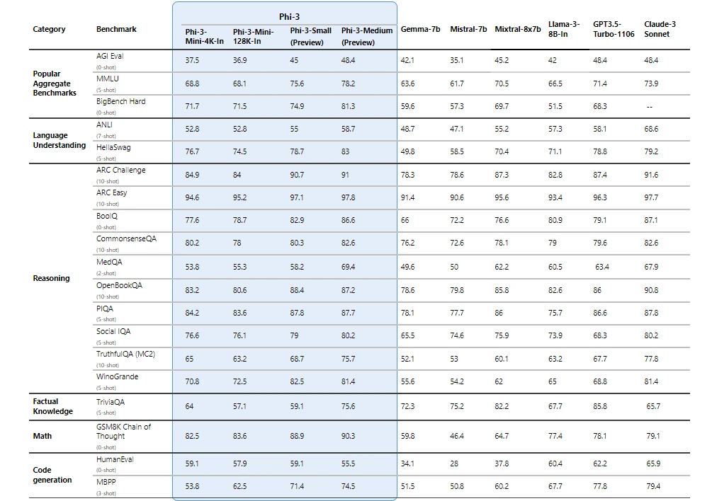 Phi-3-small (parametri 7B) e Phi-3-medium (parametri 14B) saranno presto disponibili e offriranno proposte di valore simili con prestazioni scalari.