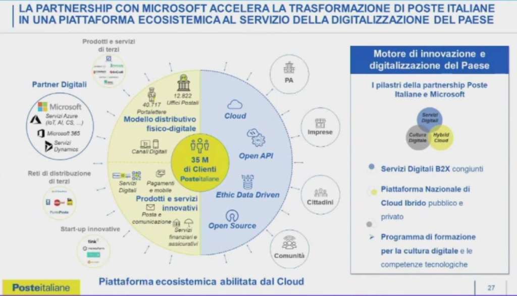 Matteo Del Fante, amministratore delegato di Poste Italiane, ha osservato come con l’apertura della region italiana di Microsoft Azure “avremo meno latenza e più spinta per il Paese. Noi testiamo le capacità dei nostri partner in modo massivo, e negli ultimi tre anni abbiamo accelerato notevolmente. Il nostro piano industriale 2022 è di trasformazione in un’azienda piattaforma e il cloud è il motore di questa trasformazione, anche con le startup, con cui avviamo i progetti di spinta in avanti“.