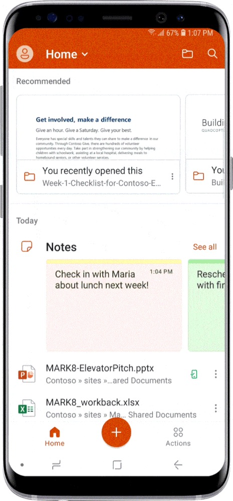 Office mobile consente di accedere in modo facile e veloce ai documenti recenti e consigliati archiviati nel cloud o sul dispositivo così come di cercare documenti all’interno dell’azienda, se si utilizza un account di lavoro. Offre anche un accesso facile a Sticky Notes per annotare rapidamente promemoria e idee.