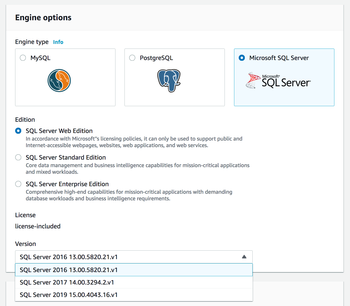 Per creare un’istanza di database, tra le Engine options come Engine type è ora possibile scegliere Microsoft SQL Server, oltre a MySQL e PostgreSQL, e poi è possibile selezionare la propria edizione (SQL Server Enterprise Edition, Standard Edition o Web Edition) e versione.