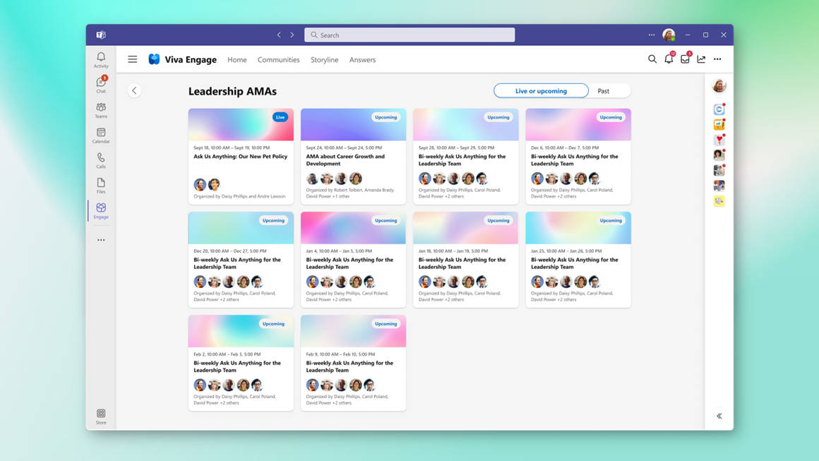 Per contribuire a questo processo, sarà incluso un nuovo stile di evento in Viva Engage, chiamato “Ask Me Anything (AMA) events” per modernizzare l’esperienza standard delle townhall attraverso upvoting, Q&A e funzioni di discussione coinvolgenti come GIF e immagini.