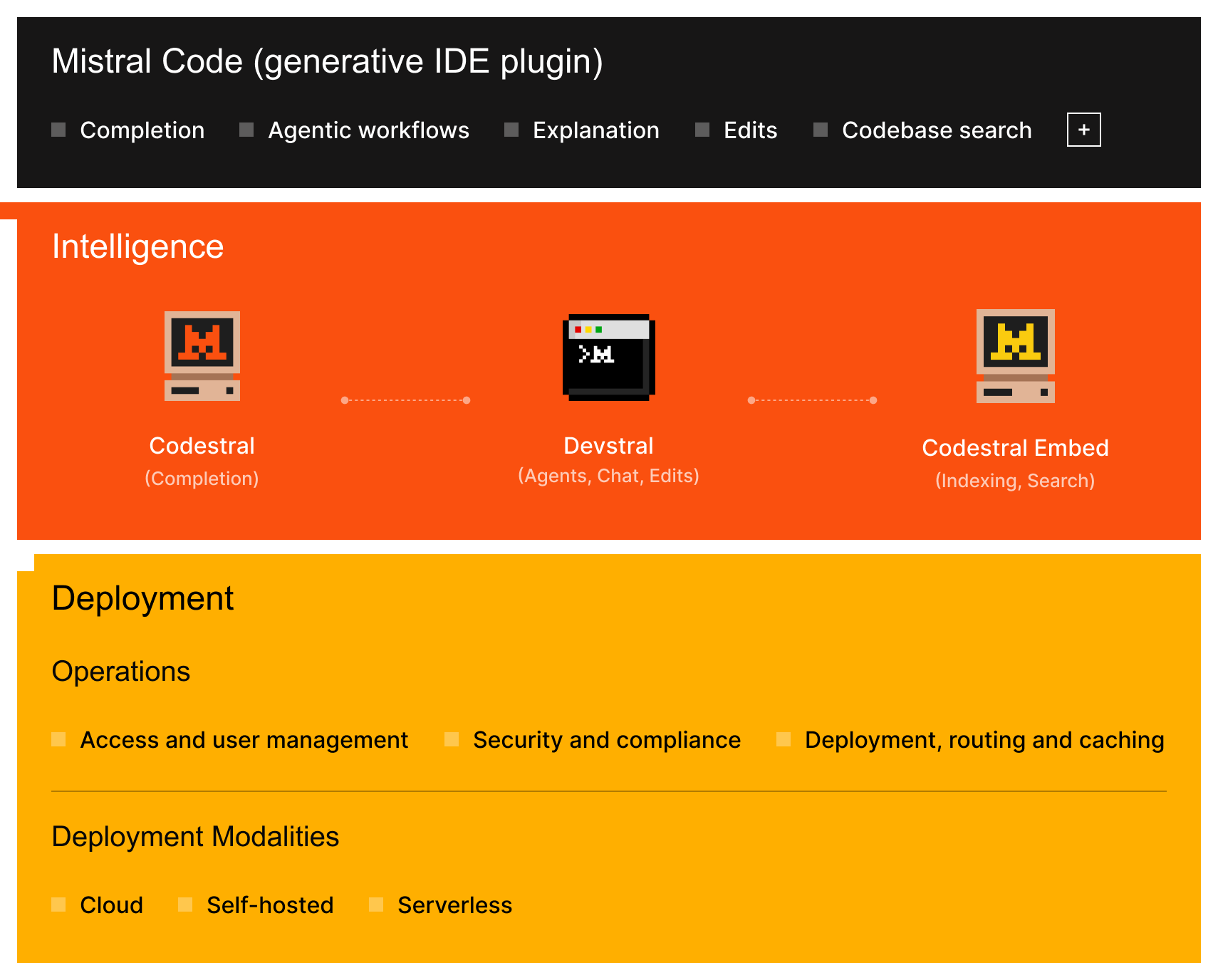 Lo stack di sviluppo completo Mistral, composto da Codestral 25.08, Devstral, Codestral Embed e l’estensione Mistral Code IDE, è ora disponibile per l’implementazione enterprise.