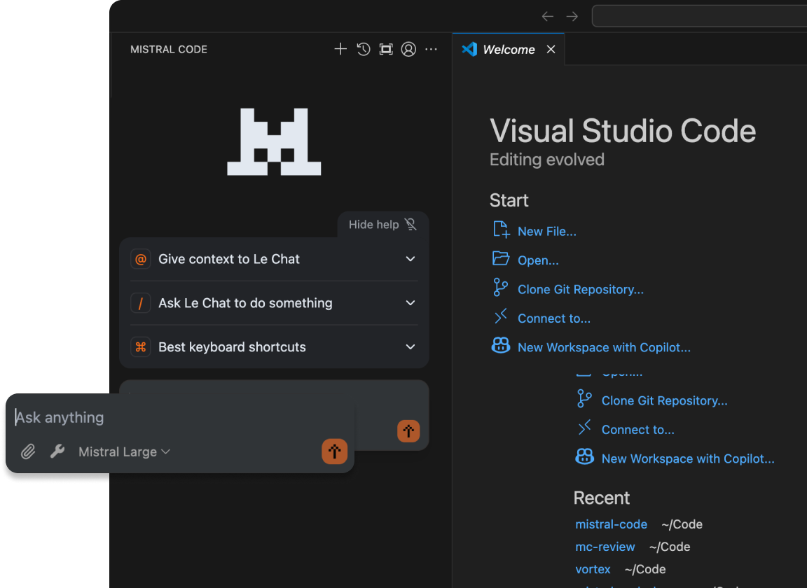 Tutte le funzionalità dello stack Mistral (completamento, ricerca semantica e flussi di lavoro agentici) sono disponibili tramite Mistral Code, un plugin nativo per JetBrains e VS Code.