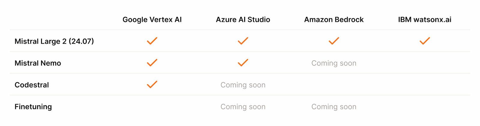 L’azienda sta anche collaborando con i principali fornitori di servizi cloud per portare il nuovo Mistral Large 2 a un pubblico globale. In particolare, sta ampliando la partnership con Google Cloud Platform per portare i modelli di Mistral AI su Vertex AI tramite una Managed API. I migliori modelli di Mistral AI sono ora disponibili su Vertex AI, oltre che su Azure AI Studio, Amazon Bedrock e IBM watsonx.ai.