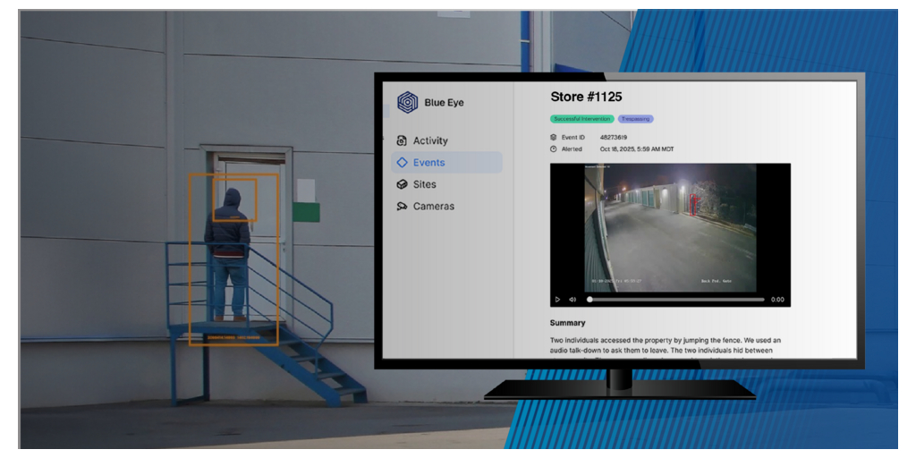 Blue Eye provides a comprehensive RVM service powered by AI to help detect threats in real time, enabling live voice talk-downs to deter crime and providing verified alerts to help accelerate law enforcement response. The company’s software platform is interoperable with leading cameras and video management systems (VMS), allowing enterprises to integrate with existing security solutions.