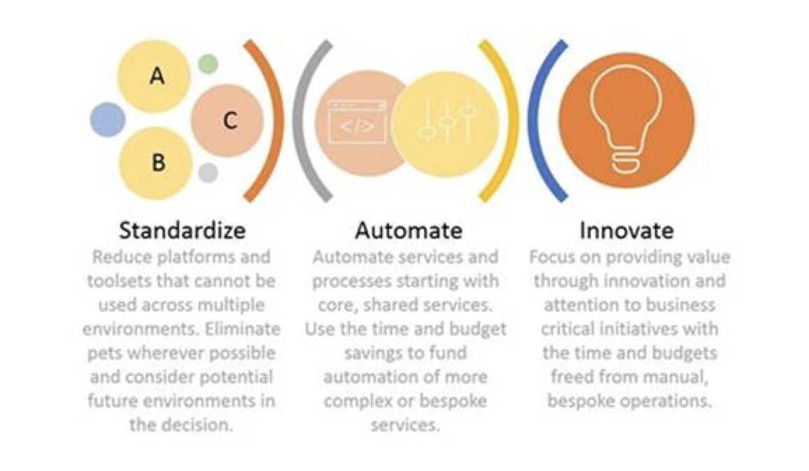 Standardizzando il provisioning e la gestione di quelle risorse comuni (servizi), per il computing, la rete e lo storage, l’automazione (ossia DevOps) può essere applicata e si può ottiene una migliore economia di scala.