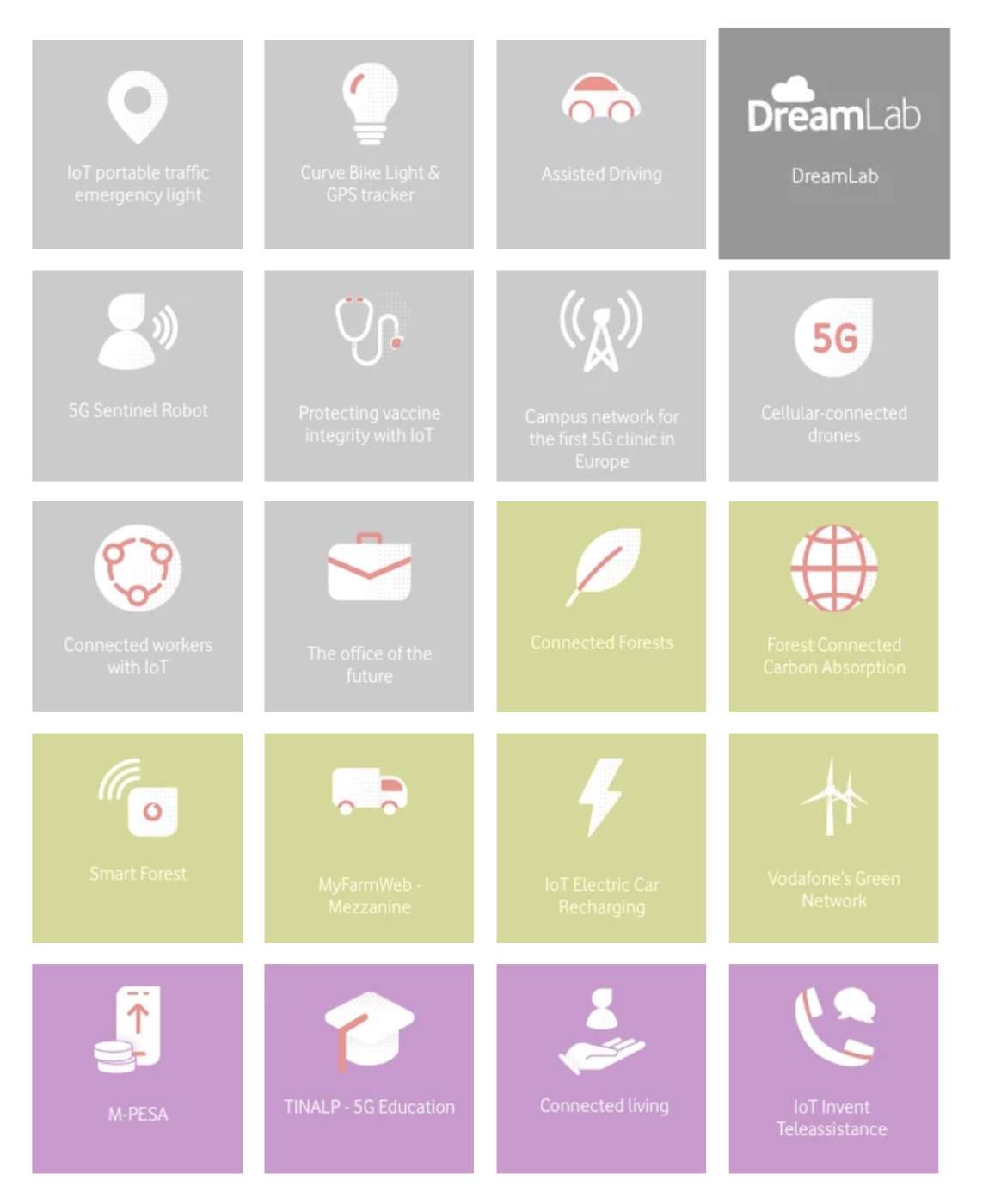 Nel contesto del Mwc 2021 Vodafone mette in mostra sul proprio sito venti progetti che concretizzano l’approccio digitale afferenti ai temi della vita quotidiana, dalla casa alla salute, dal lavoro alla formazione, secondo le tre macro iniziative facenti capo al tema della sostenibilità: i inclusione (colore lilla), società digitale (grigio) e pianeta (verde).