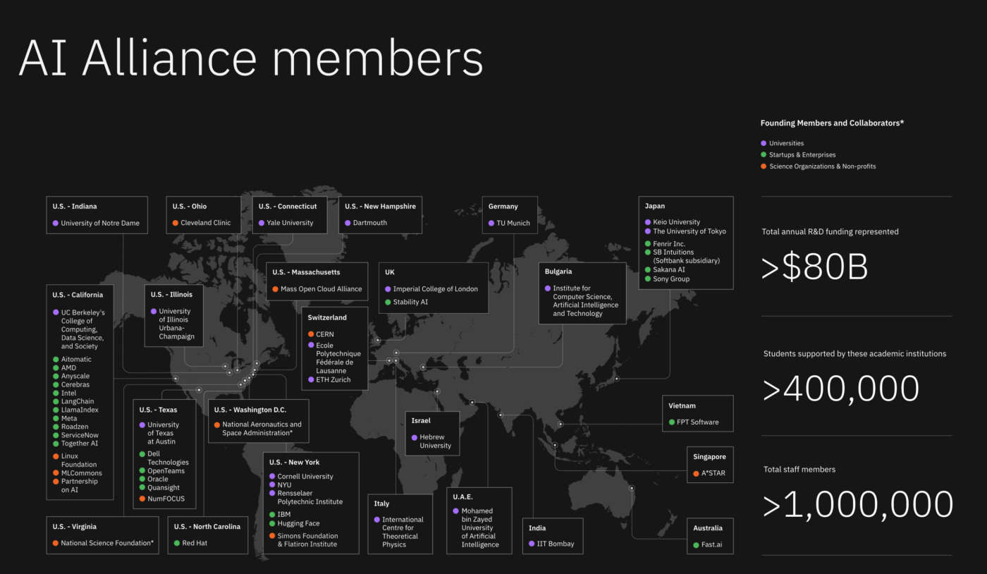 L’AI Alliance è lanciata congiuntamente da IBM e Meta insieme a organizzazioni leader del settore, della pubblica amministrazione e del mondo accademico. I partner e i collaboratori includono: Agency for Science, Technology and Research (A*STAR); Aitomatic; AMD; Anyscale; Cerebras; CERN; Cleveland Clinic; Cornell University; Dartmouth; Dell Technologies; École Polytechnique Fédérale de Lausanne; ETH Zurich; Fast.ai; Fenrir, Inc.; FPT Software; Hebrew University of Jerusalem; Hugging Face; IBM; Abdus Salam International Centre for Theoretical Physics (ICTP); Imperial College London; Indian Institute of Technology Bombay; Institute for Computer Science, Artificial Intelligence; Intel; Keio University; LangChain; LlamaIndex; Linux Foundation; Mass Open Cloud Alliance, operated by Boston University and Harvard; Meta; Mohamed bin Zayed University of Artificial Intelligence; MLCommons; National Aeronautics and Space Administration; National Science Foundation; New York University; NumFOCUS; OpenTeams; Oracle; Partnership on AI; Quansight; Red Hat; Rensselaer Polytechnic Institute; Roadzen; Sakana AI; SB Intuitions; ServiceNow; Silo AI; Simons Foundation; Sony Group; Stability AI; Together AI; TU Munich; UC Berkeley College of Computing, Data Science, and Society; University of Illinois Urbana-Champaign; The University of Notre Dame; The University of Texas at Austin; The University of Tokyo; Yale University.