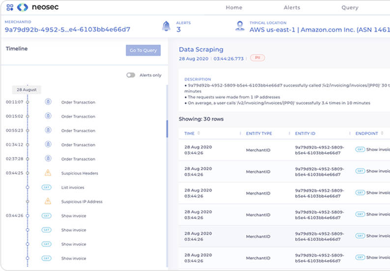 Neosec apprende automaticamente il comportamento di base di ogni utente e client API, correlando e profilando per più entità, compresi utenti, clienti, processi aziendali e partner. Abilita la possibilità di vedere, indagare e respingere le minacce utilizzando timeline dettagliate del comportamento di ogni entità utente.