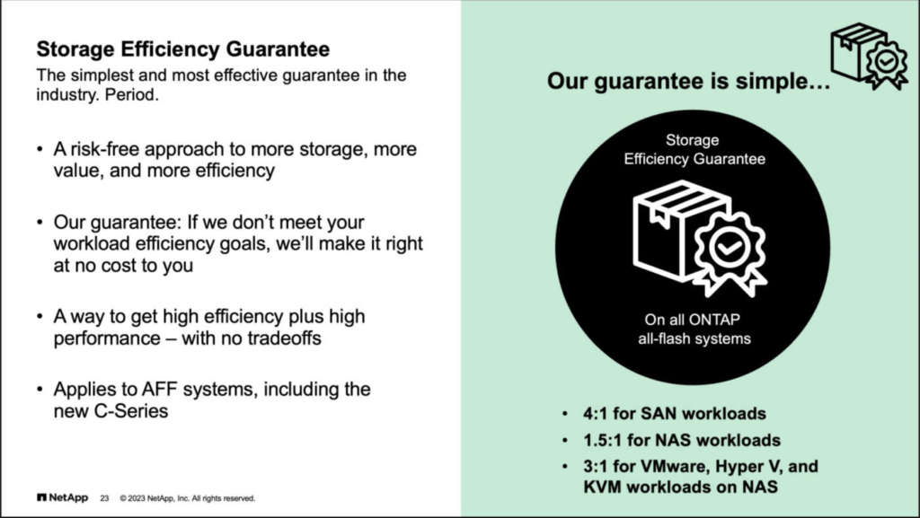 Il programma Storage Efficiency Guarantee 4:1 di NetApp per ambienti SAN garantisce che, se gli obiettivi di efficienza del carico di lavoro non sono raggiunti, NetApp li correggerà senza alcun costo per il cliente.