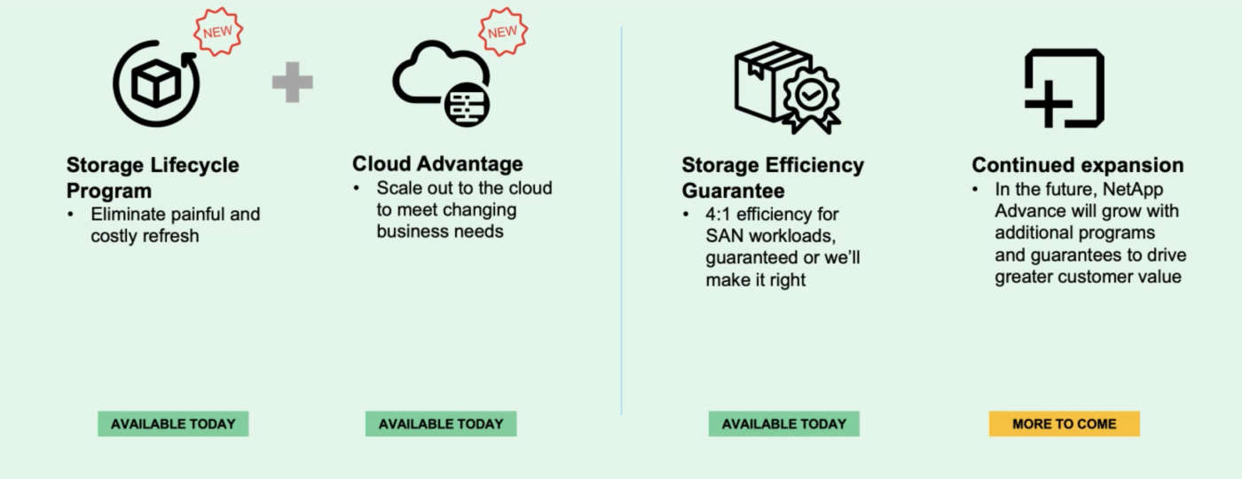 I nuovi vantaggi di NetApp Advance includono riduzione dei costi, della complessità e delle interruzioni delle attività dovute all’aggiornamento tecnologico grazie all’acquisto di una sola soluzione e alla continua evoluzione; riduzione dei rischi precedentemente associati al passaggio al cloud ibrido, con la flessibilità di scalare facilmente verso il cloud se o quando il business lo richiede.