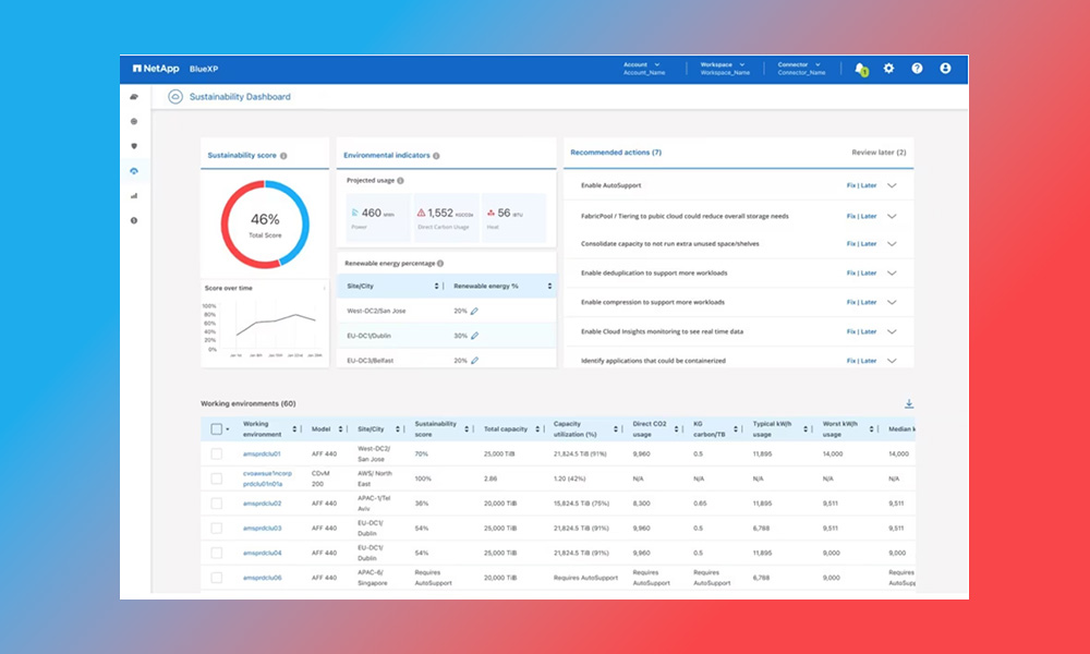 NetApp ha così deciso di mettere la sostenibilità al centro della dashboard di NetApp BlueXP. BlueXP, annunciato in occasione di INSIGHT 2022, è il pannello di controllo unificato di NetApp per i data estate aziendali in ambienti multicloud ibrido, che prende in considerazione sia risorse on-premise che basate sul cloud. Semplifica enormemente la gestione dello storage e dei dati in modo che i manager possano ottimizzare l’utilizzo delle risorse per raggiungere i propri obiettivi aziendali.