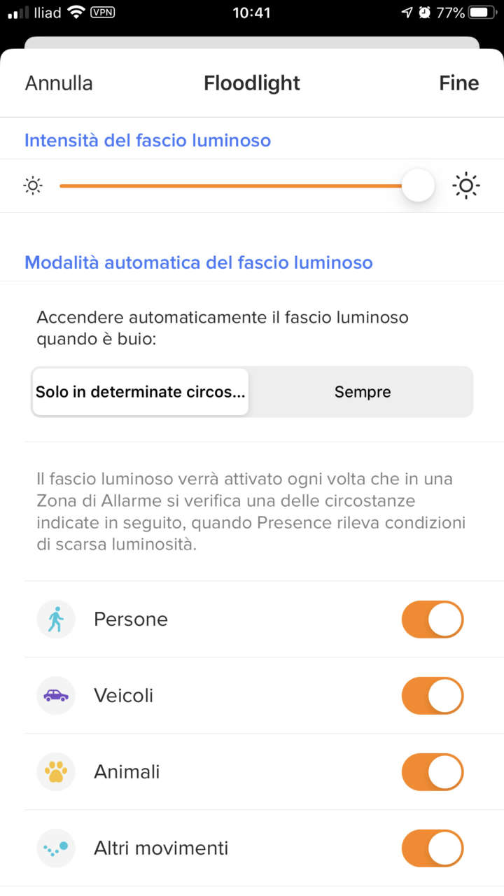 Il sistema operativo della videocamera è in grado di distinguere e classificare alcune famiglie di oggetti in movimento nelle immagini: persone, animali domestici e veicoli. Mediante l’app è possibile scegliere quali di queste categorie devono attivare il fascio luminoso e quali essere notificate tramite avviso sullo smartphone.