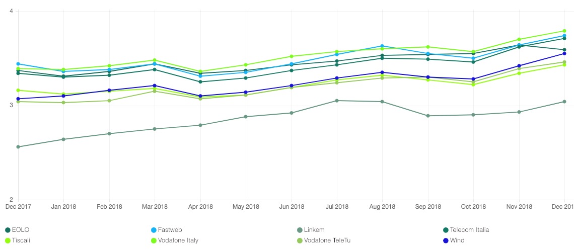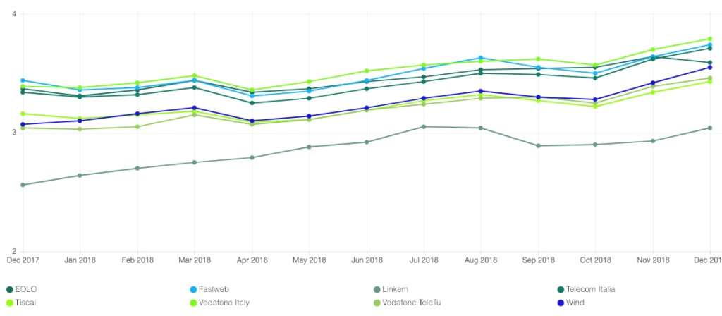 Al secondo posto troviamo Fastweb con una velocità di 3,74 Mbps. Telecom Italia raggiunge il podio piazzandosi al terzo posto, con una velocità di 3,71 Mbps.