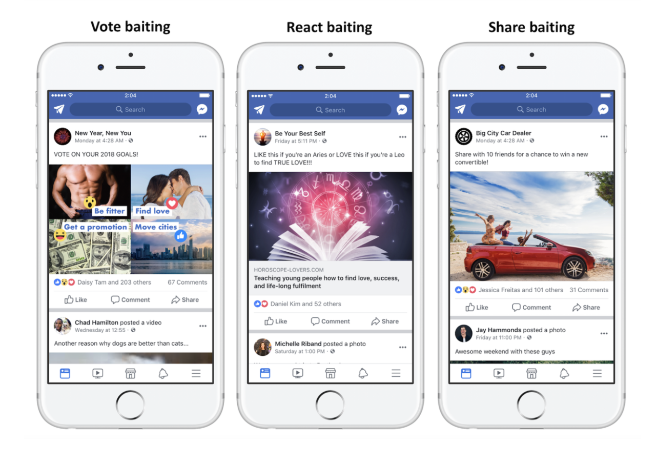 L’utilizzo del cosiddetto “engagement bait“, tecnica utilizzata per spingere le persone a commentare i post, non è considerata un’interazione significativa, e Facebook continuererà a penalizzare questi post nel news feed.