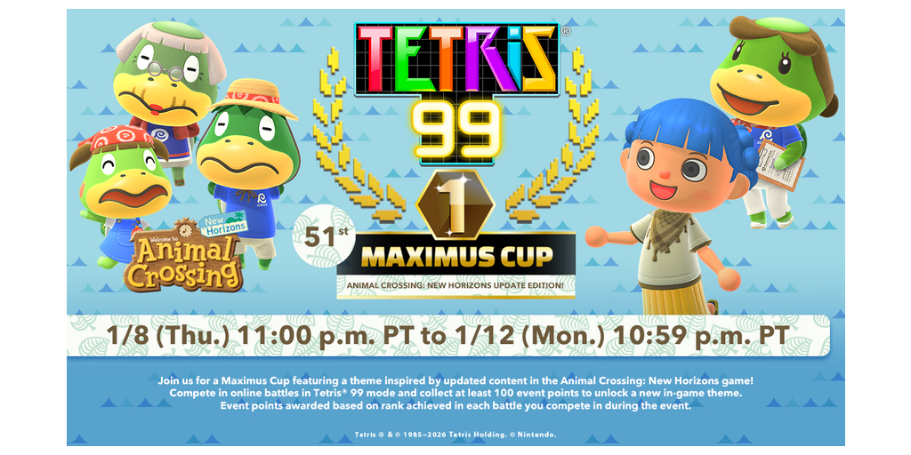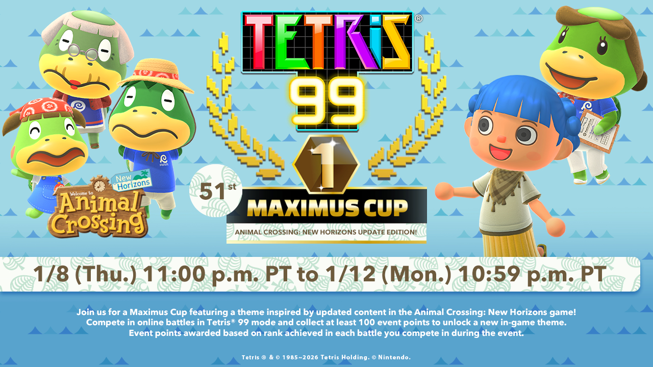 - Tetris® 99 51st MAXIMUS CUP – Welcome back, neighbor! Some friendly familiar faces from the Animal Crossing: New Horizons game are popping up in the Tetris® 99 game for its 51st MAXIMUS CUP event! Nintendo Switch Online1 members playing the Tetris 99 online mode during the event period can collect 100 event points to unlock a new theme featuring art, music and Tetrimino designs inspired by the updated content in Animal Crossing: New Horizons. The Tetris 99 51st MAXIMUS CUP event will run from Jan. 8 at 11 p.m. PT to Jan. 12 at 10:59 p.m. PT. Also, don’t forget that Animal Crossing: New Horizons will receive a brand-new update on Jan. 15!