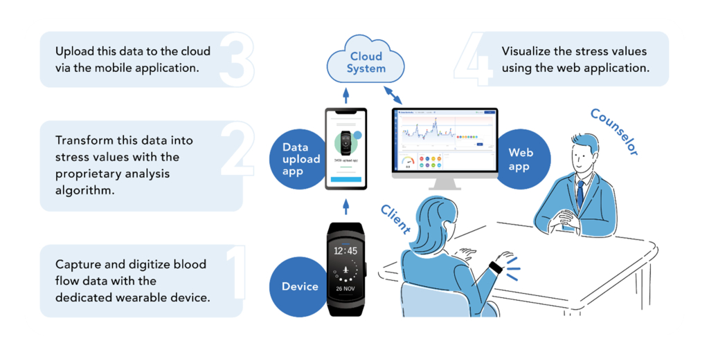 Counseling System is a service that provides information useful to both the counselor and their clients, using a measurement device worn by the client to analyze and visualize physiological data (changes in blood flow) in real time as stress values generated by an algorithm developed by Nitto.