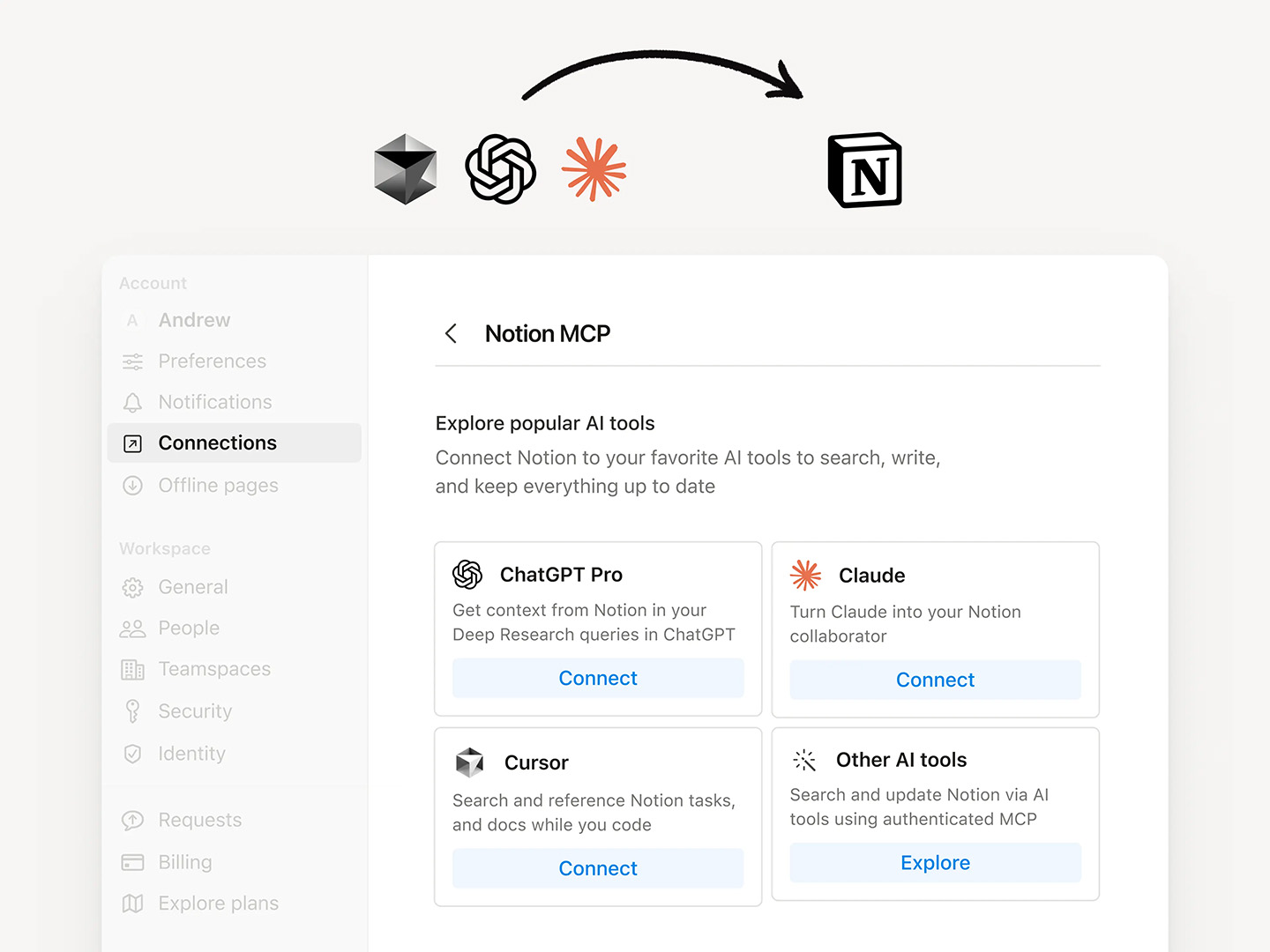 Inoltre, il server Model Context Protocol (MCP) di Notion consente ai propri strumenti di intelligenza artificiale di fare riferimento, creare e aggiornare in modo sicuro i contenuti all’interno di Notion. Basta collegare ChatGPT, Claude o Cursor per trasformare i prompt in nuove pagine Notion, attività aggiornate e altro ancora.