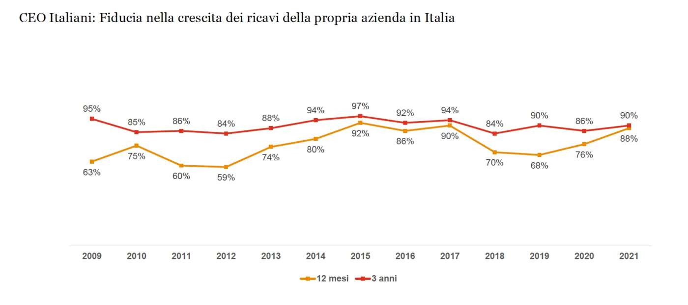 L’88% dei Ceo italiani intervistati è fiducioso circa la crescita nei prossimi 12 mesi, dato in aumento di 12 punti rispetto all’anno scorso, mentre i livelli di fiducia per il triennio arrivano al 90%, guadagnando 4 punti, rispetto alla precedente rilevazione.