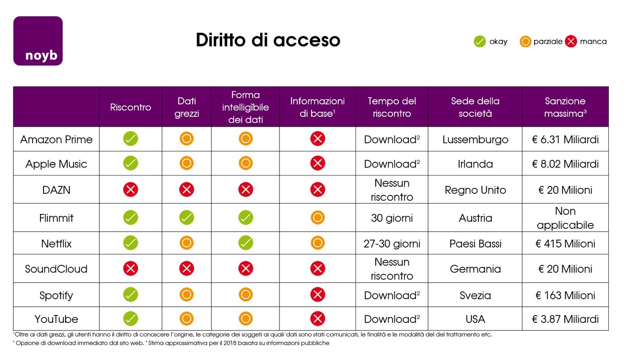 L’associazione ha individuato forme diverse di violazioni dell’articolo 15 del GDPR da parte di varie società, tra cui Amazon, Apple, Dazn, Spotify e Netflix.